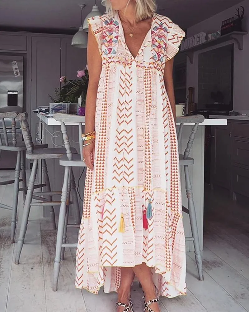Printed V Neck Ruffle Hem Sleeveless Tassel Design Casual Loose Midi Dress